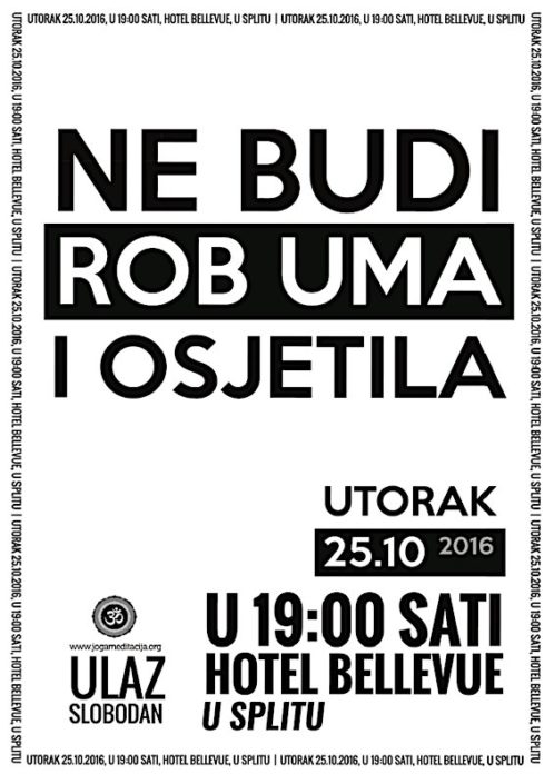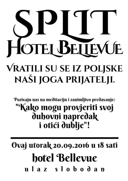 Prema drevnom joga naputku svi naši sastanci i aktivnosti su besplatni. Trenutno se većina naših aktivnosti odvija u Splitu, ali mi također planiramo događanja u Zagrebu. Ukoliko bude više zainteresiranih, doći ćemo i u druga mjesta. Dakle, slobodno nas kontaktirajte!
